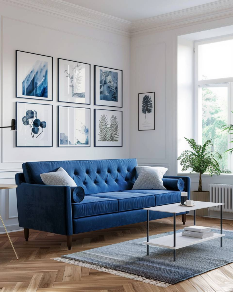 Bringe persönliche Kunstdrucke an mehreren Wänden an. Setze Rahmenfarben, Motive und Größen so ein, dass unser blaues Sofa mit den Bildern zusammenpasst. Hänge abstrakte Kunst, Naturaufnahmen oder typografische Poster gezielt verteilt auf. So entstehen Akzente, die dem Raum mehr Charakter geben.