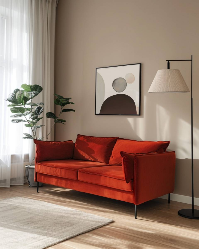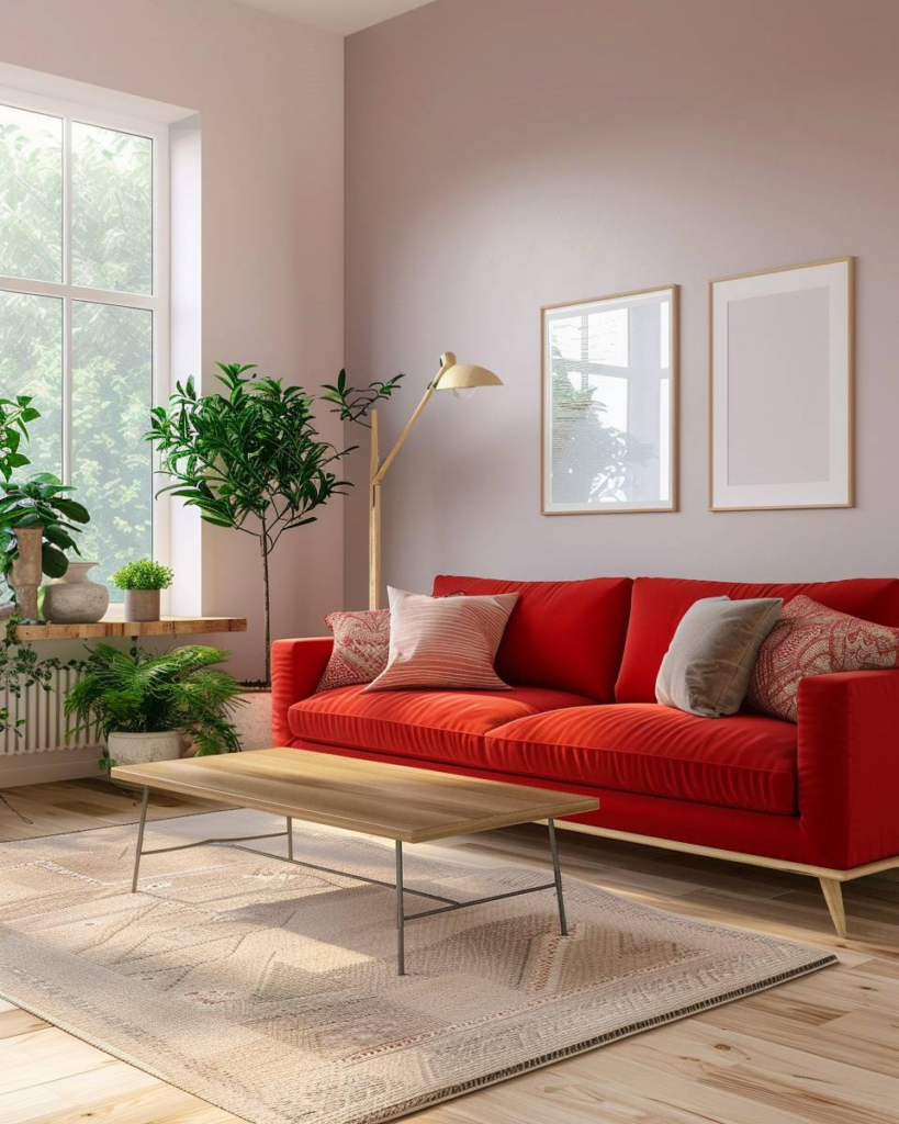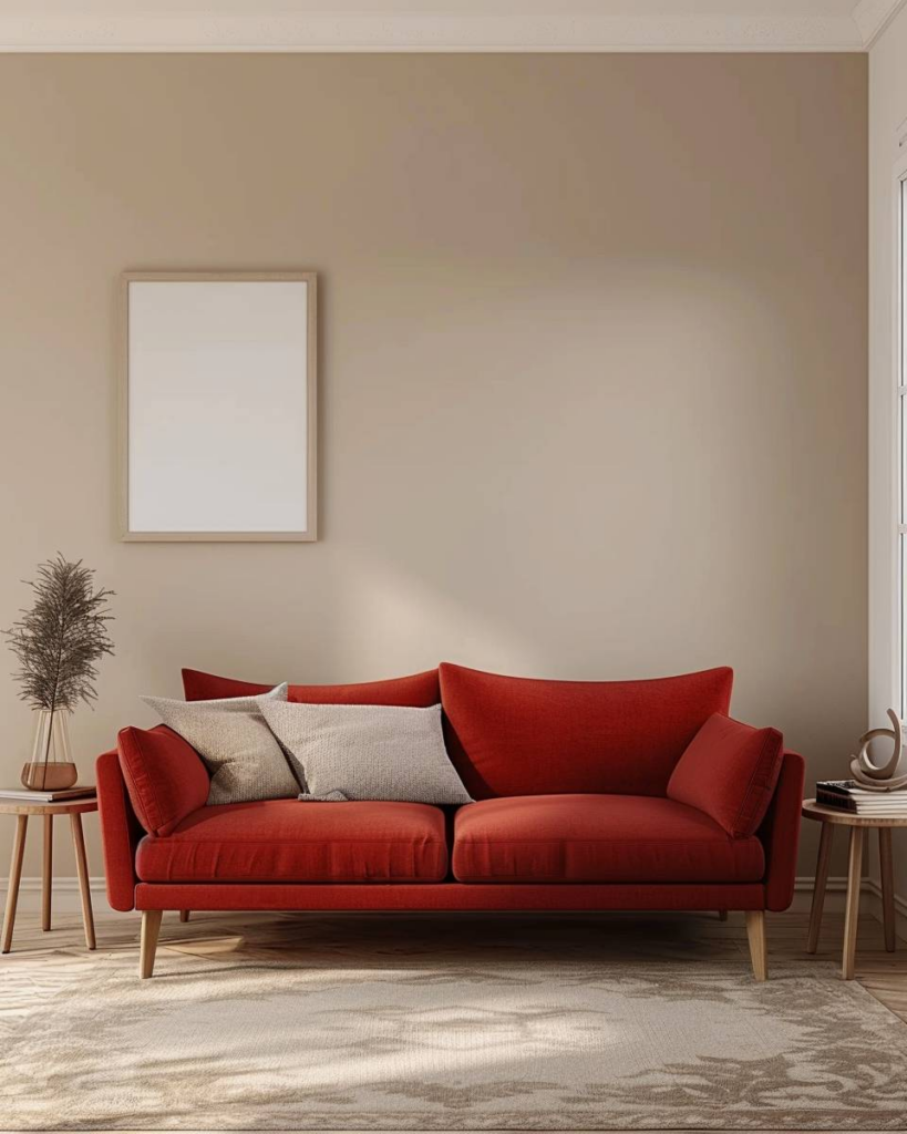 Setze auf sanfte Wandfarben wie Beige, Hellgrau oder Creme. Sie schaffen einen ruhigen Kontrast zum roten Sofa. Dezente Töne beruhigen den Raum und lassen das Sofa modern wirken. Wir vermeiden starke Muster, da sie Unruhe bringen.
