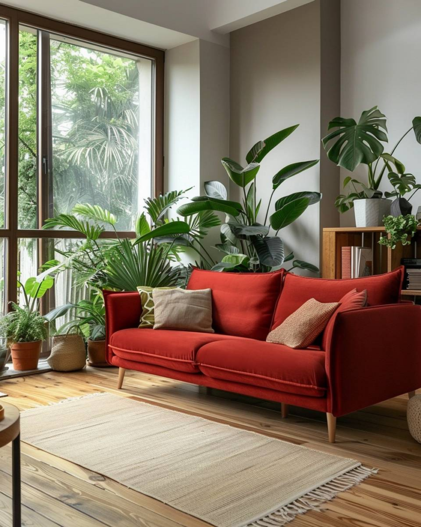 Stelle große Pflanzen in hohen Töpfen rund um das rote Sofa auf. Wir greifen so die Farbe vom Sofa auf und bringen einen schönen Kontrast mit viel Grün ins Wohnzimmer. Große Blätter wie von Monstera oder Ficus rahmen das Sofa ein. Die Töpfe auf dem Boden sorgen dafür, dass das Sofa noch mehr im Mittelpunkt steht. Du schaffst Gemütlichkeit und belebst den Raum.