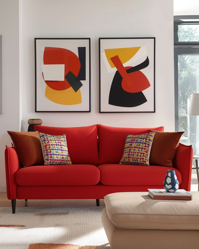 Wir bringen große, bunte Bilder direkt über das rote Sofa an. Starke Farben und klare Formen setzen das Sofa sofort in Szene. Ein großes Rahmenbild gibt dem Raum Ruhe und Charakter. Schwarz-weiß-Fotografien sind spannend, wenn wir einen modernen Look nutzen. Achte auf gute Ausleuchtung, damit die Kunst lebendig wirkt.
