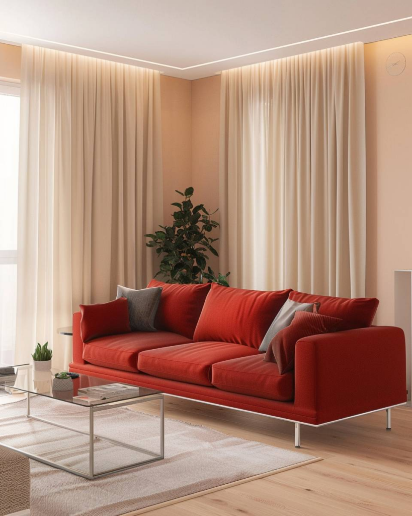 Wähle Vorhänge in zarten Beigetönen, damit das rote Sofa im Wohnzimmer ruhig wirkt. Beige schafft einen weichen Kontrast zu Rot. Helle Stoffe lassen das Zimmer größer wirken. Wir sorgen mit Beigetönen für eine freundliche und warme Atmosphäre.