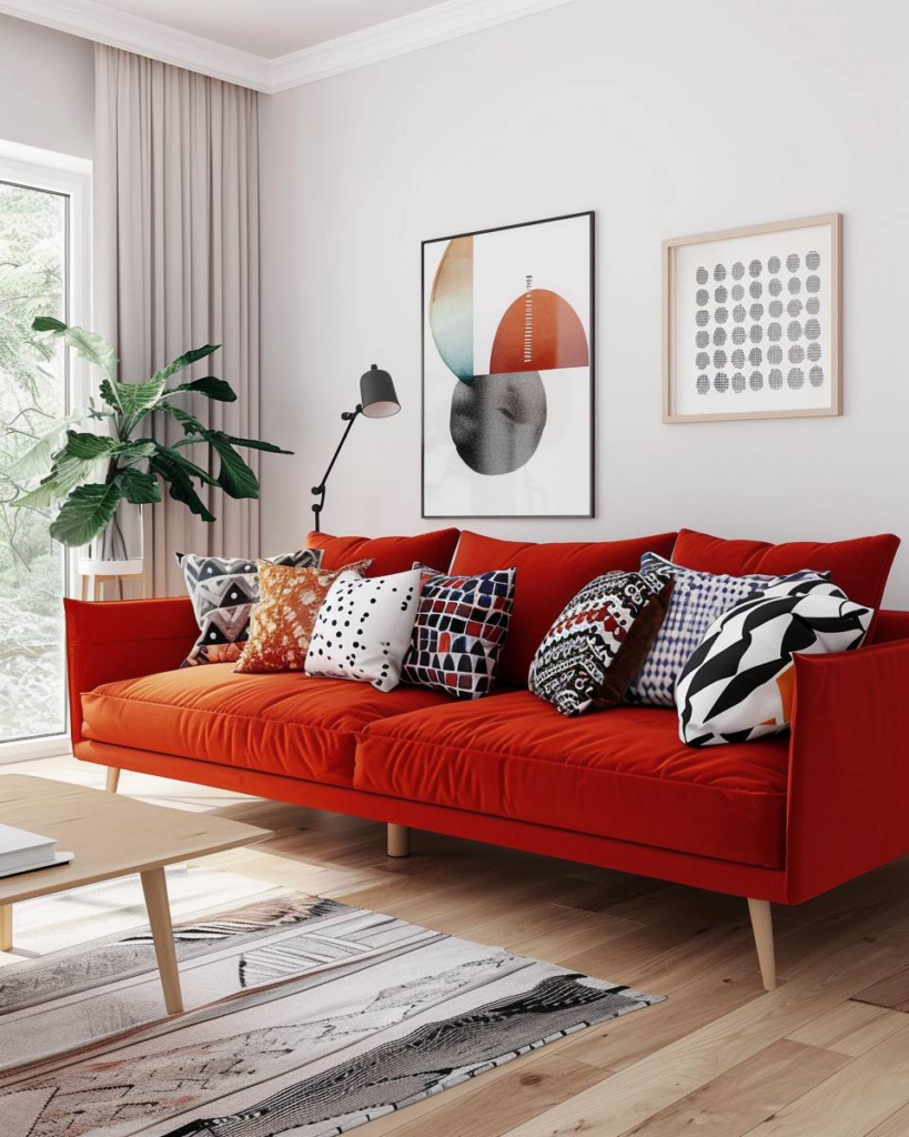 Wähle grafische Kissen, damit das rote Sofa lebendig wirkt. Kontrastreiche Muster wie Streifen oder geometrische Formen bringen Bewegung in den Raum. Farben wie Schwarz, Weiß oder Grau schaffen klare Linien und lassen das Rot leuchten. Kombiniere wenige starke Designs, damit dein Wohnzimmer frisch und modern bleibt.
