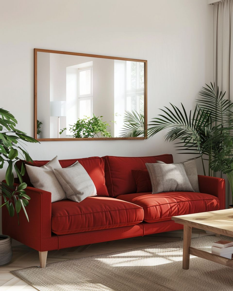 Setzen wir Spiegel gegenüber vom Fenster ein, lenken wir mehr Tageslicht auf das rote Sofa. Ein großer Spiegel an der Wand hinter dem Sofa bringt Helligkeit und Weite in den Raum. Der Mix aus Spiegel, Licht und den Akzenten des Sofas hebt das Wohnzimmer klar hervor.