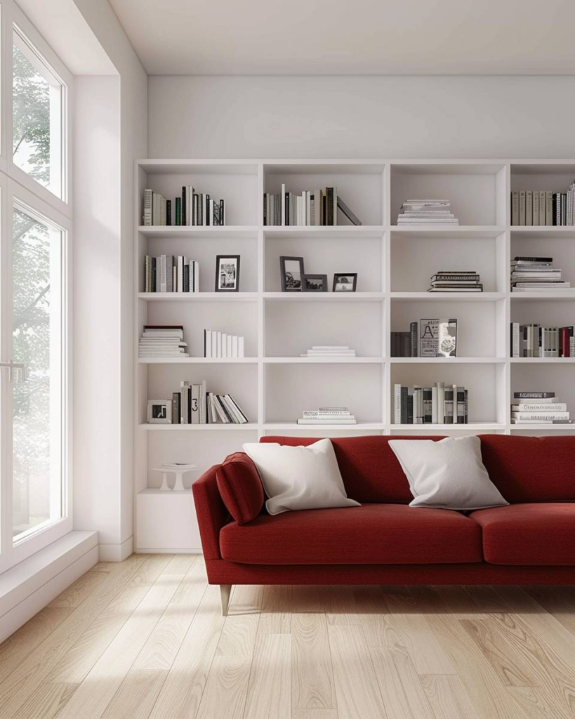 Setze auf schlichte Bücherregale mit klaren Linien. Holz oder Metall in neutralen Tönen lässt dein rotes Sofa im Mittelpunkt stehen. Dezente Regale geben dem Raum mehr Ruhe und lenken nicht ab. Verzichte auf verschnörkelte Details oder bunte Farben.
