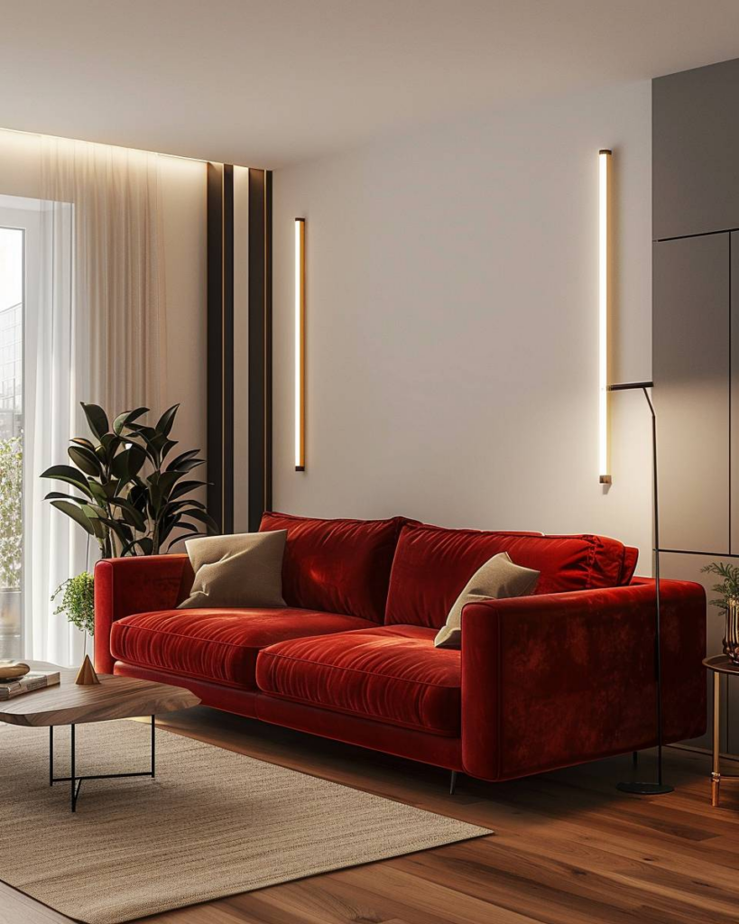 Nutze verschiedene Stoffe. Samt wirkt edel und weich, Leinen ist luftig und natürlich. Kissen und Decken aus diesen Materialien bringen Struktur ins Wohnzimmer. Dein rotes Sofa steht im Mittelpunkt und die Texturen schaffen Gemütlichkeit und Tiefe.