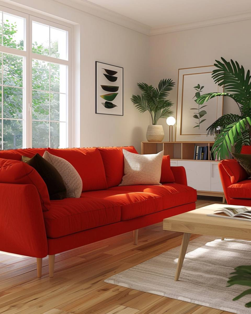 Ein rotes Sofa ist ein Statement-Möbel, das Wohnzimmer gestaltet und sofort alle Blicke auf sich zieht.