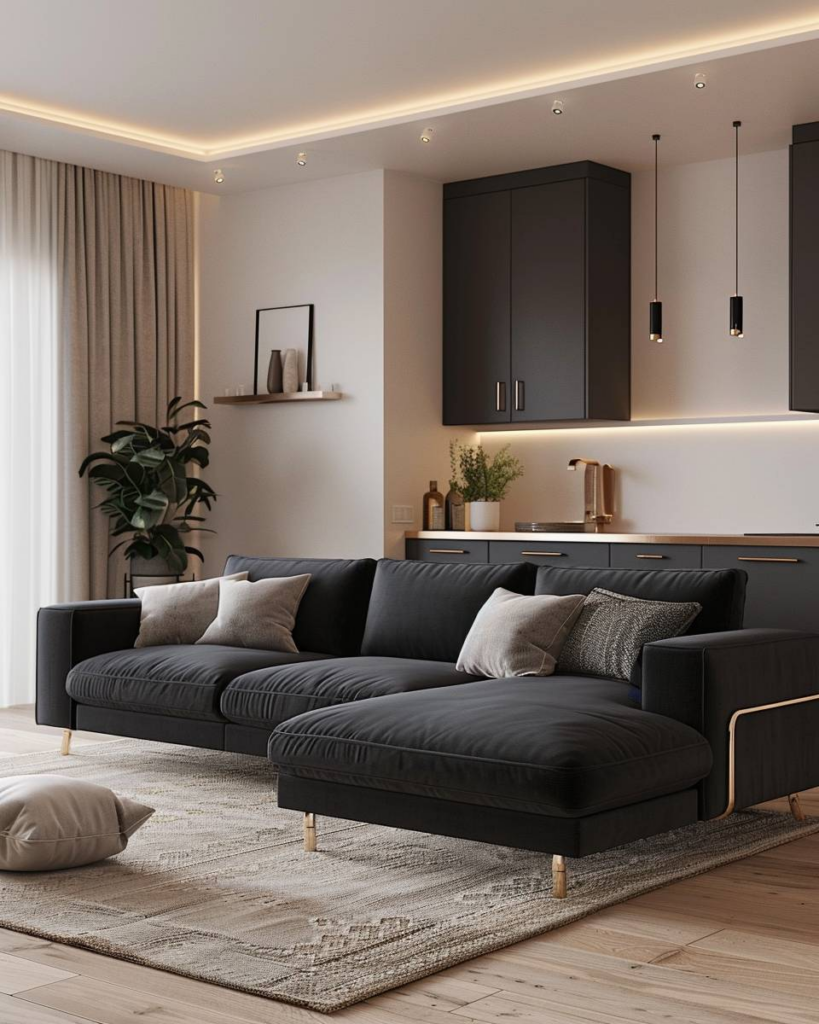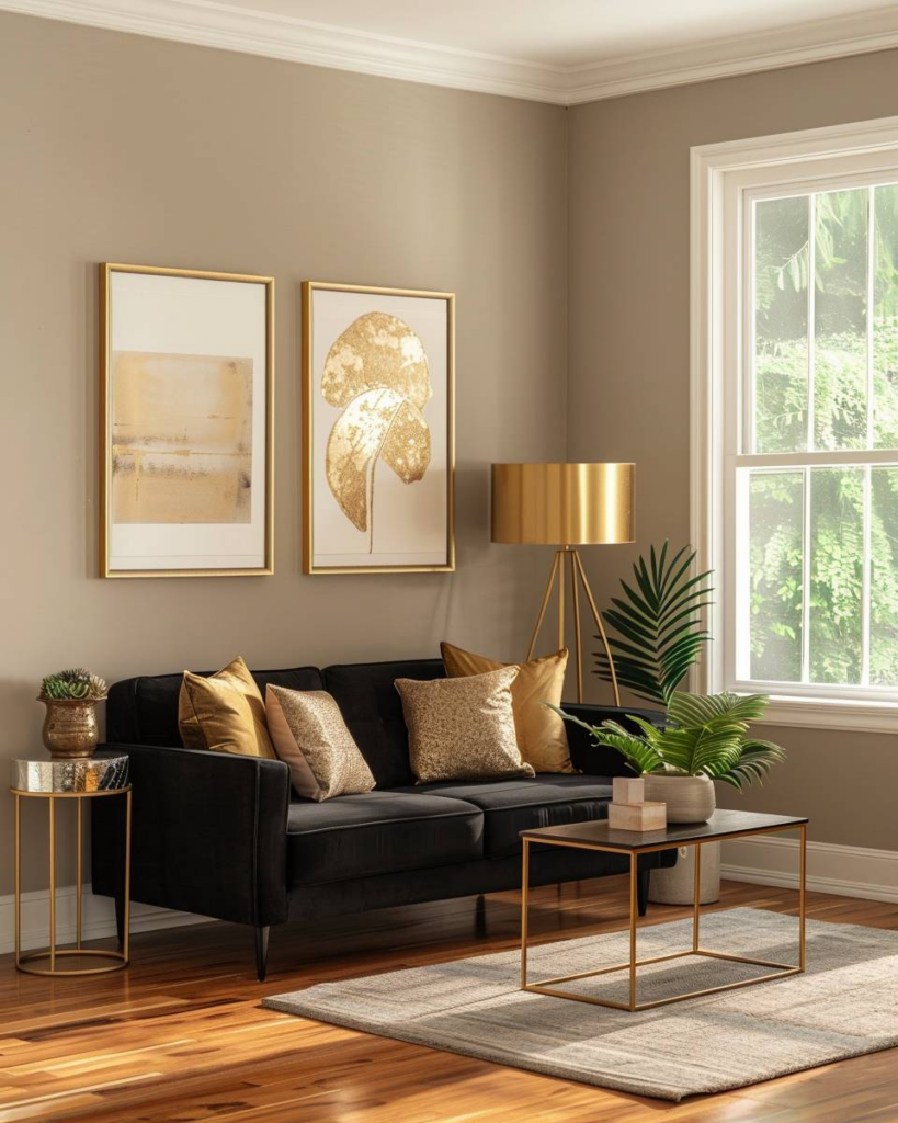 Kombiniere das schwarze Sofa mit goldenen Akzenten