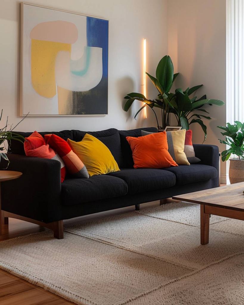 Ein schwarzes Sofa ist im Wohnzimmer ein starker Blickfang, aber du willst es stilvoll gestalten und einrichten.