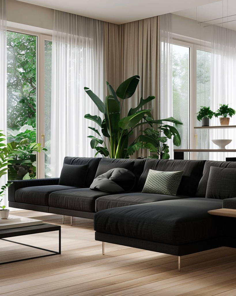 Bring frisches Grün ins Wohnzimmer und stelle Pflanzen direkt ans schwarze Sofa. Große Pflanzen wie Monstera oder Ficus schaffen einen starken Kontrast zu dunklen Polstern. Kleine Sukkulenten passen auf den Beistelltisch. Natürliche Holztöpfe sorgen für einen warmen Akzent. So wirkt dein Raum sofort lebendiger und offener.