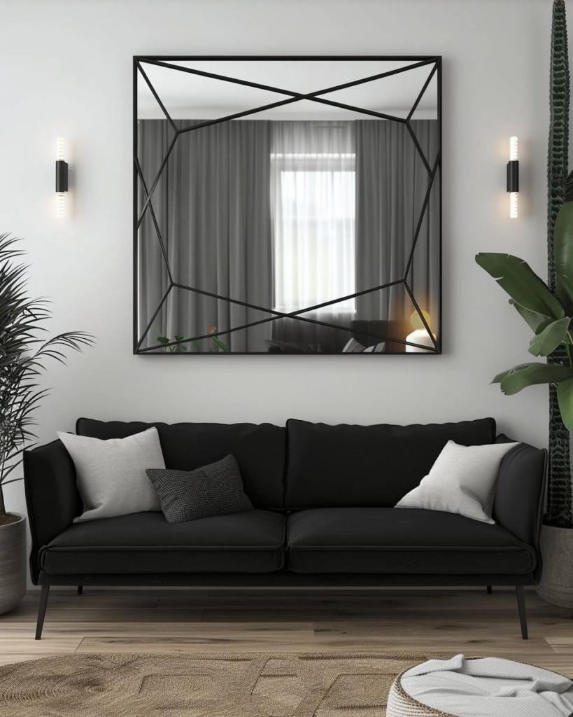 Bringe einen großen Spiegel an die Wand über deinem schwarzen Sofa. Der Spiegel reflektiert Licht und lässt dein Wohnzimmer größer wirken. Wähle einen auffälligen Rahmen, damit er als Eyecatcher dient. Wir nutzen ihn auch, um den Kontrast zum Sofa zu betonen.
