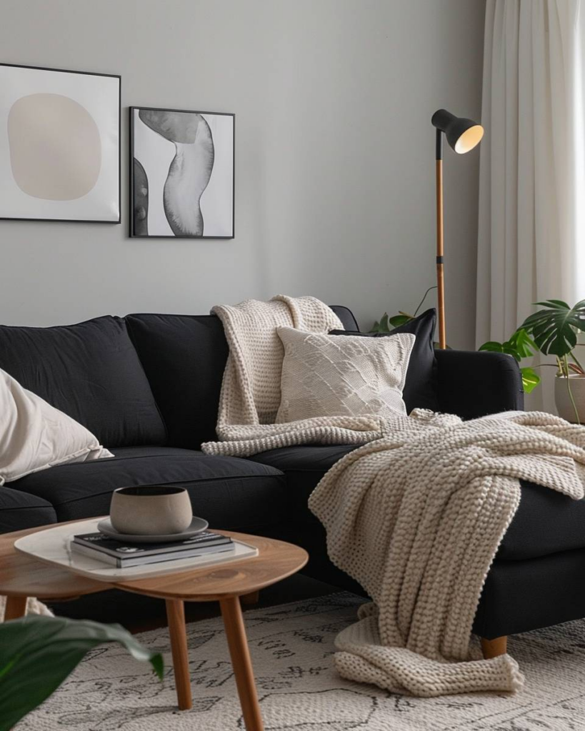 Lege weiche Decken in zarten Farben wie Beige, Hellgrau oder Creme auf das schwarze Sofa. Sie bringen Wärme und Leichtigkeit ins Zimmer. Die Decken schützen das Sofa und machen das Sitzen auf dem dunklen Bezug bequemer.