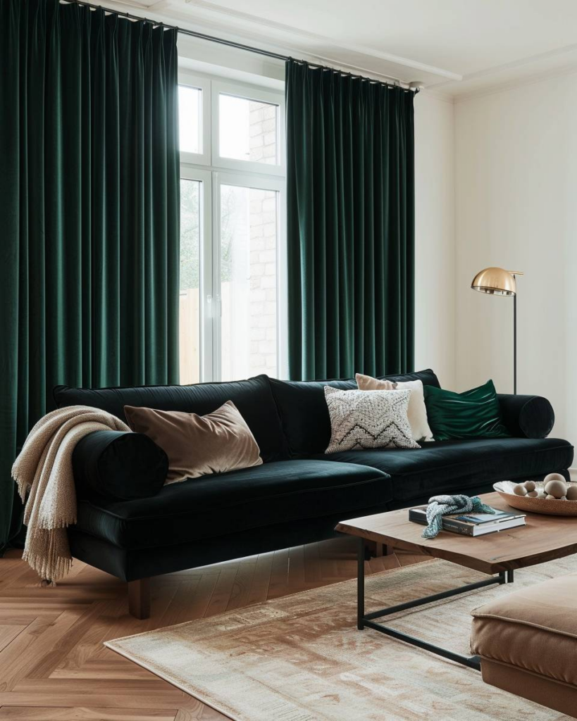 Mit samtigen Vorhängen wird das schwarze Sofa im Wohnzimmer richtig gemütlich. Der dichte Stoff nimmt Schall auf und hält Licht ab. Die weiche Haptik macht den Raum sofort wohnlich. Dunkle Töne wie Dunkelgrün oder Dunkelgrau wirken stimmig zum schwarzen Sofa und setzen ein ruhiges Statement.