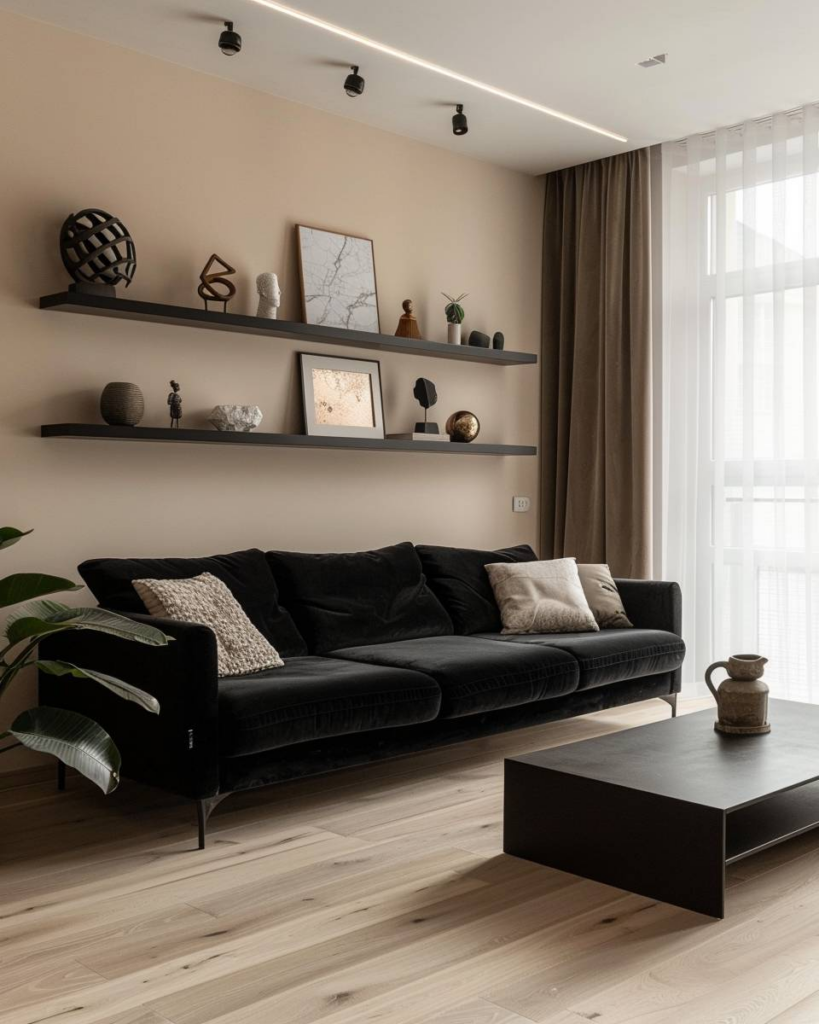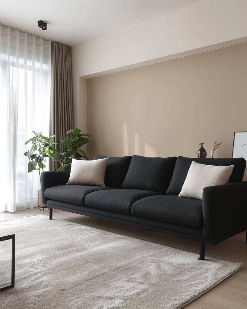 Setze auf helle Wandfarben wie Weiß oder Sand, damit das schwarze Sofa ruhiger wirkt. Grau oder Beige ist vielseitig und lässt dein Wohnzimmer offen wirken. Zarte Töne wie Pastellblau oder Salbei helfen, Gemütlichkeit zu schaffen.