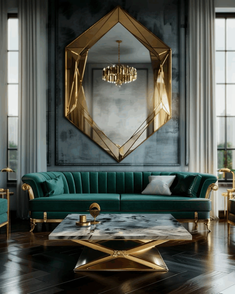 Wähle goldene Spiegel mit geometrischem Rahmen, um deinem Wohnzimmer sofort Art-Deco-Flair zu geben. Ein eckiger oder runder Rahmen setzt klare Akzente und wirkt sehr edel. Gold bringt Wärme und spiegelt Licht, was den Raum größer erscheinen lässt. Setze den Spiegel über dem Sofa oder auf einem Sideboard ein, so wirkt er direkt im Mittelpunkt.
