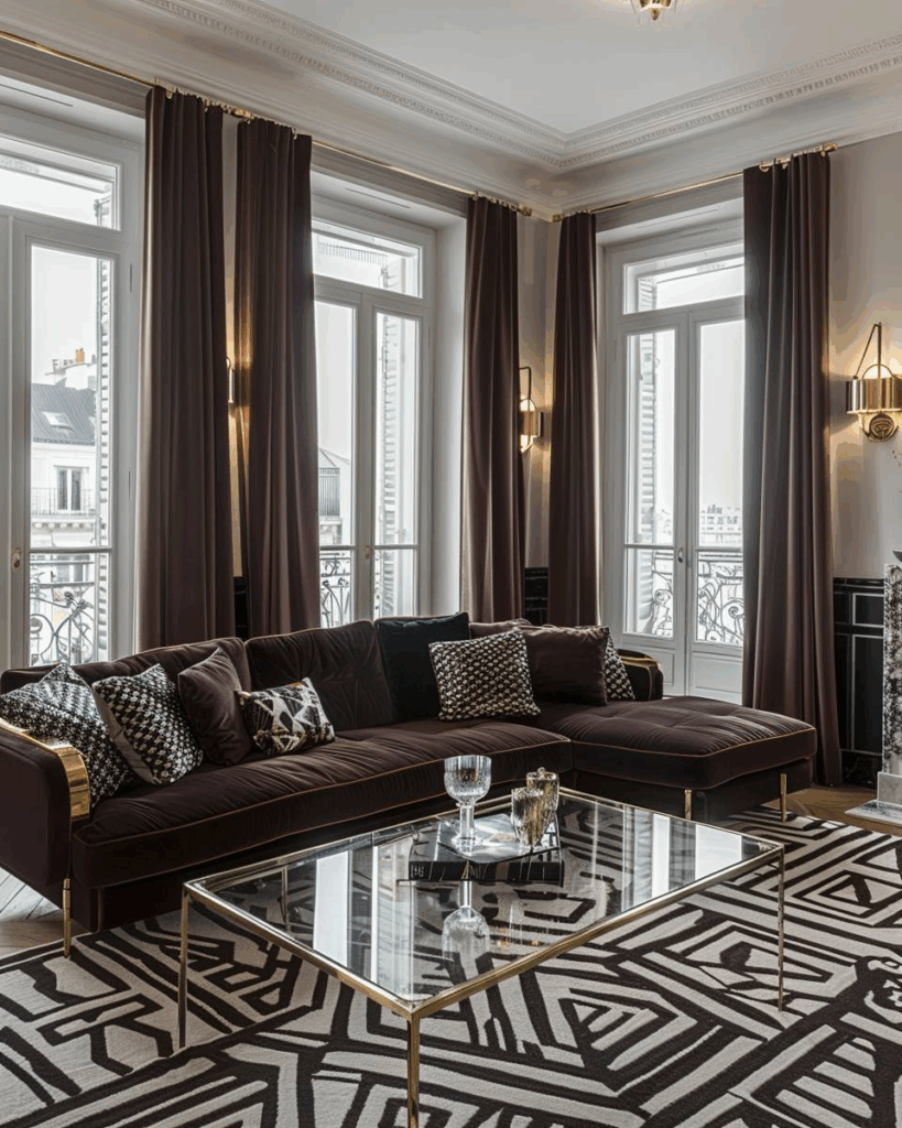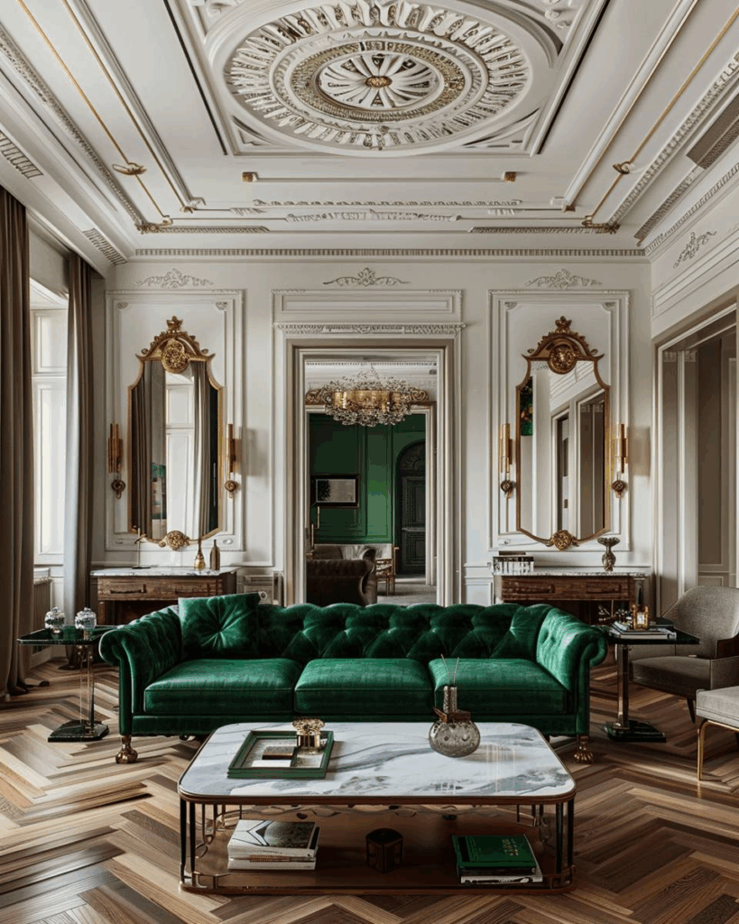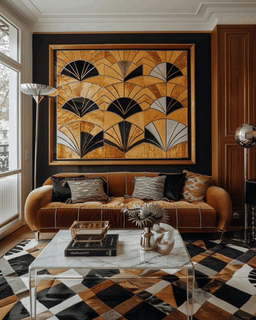 Ein Wohnzimmer im Art-Deco-Stil ist ein eleganter Raum, in dem wir mit klaren Linien, luxuriösen Materialien und starken Kontrasten gestalten und einrichten.