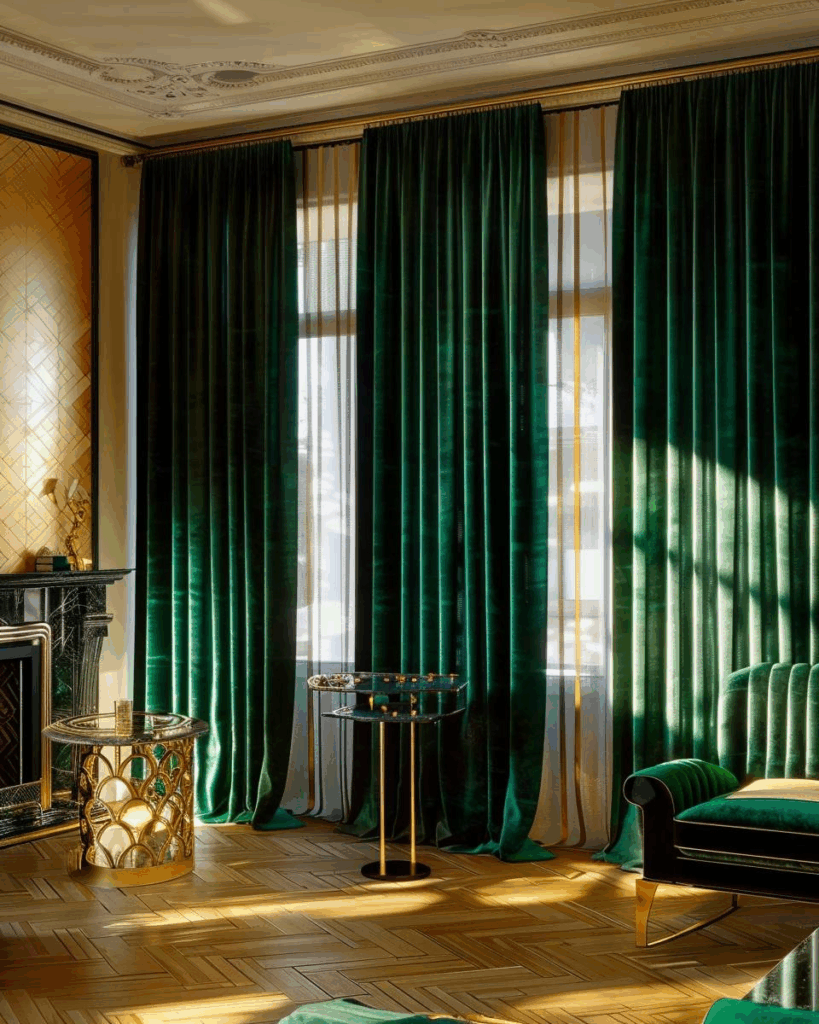 Wähle schwere Stoffe wie Samt oder Brokat für die Vorhänge. Ihr edler Fall bringt Glamour und Ruhe ins Zimmer. Dunkle Farben wie Dunkelblau oder Tannengrün passen am besten zum Art-Deco-Stil.