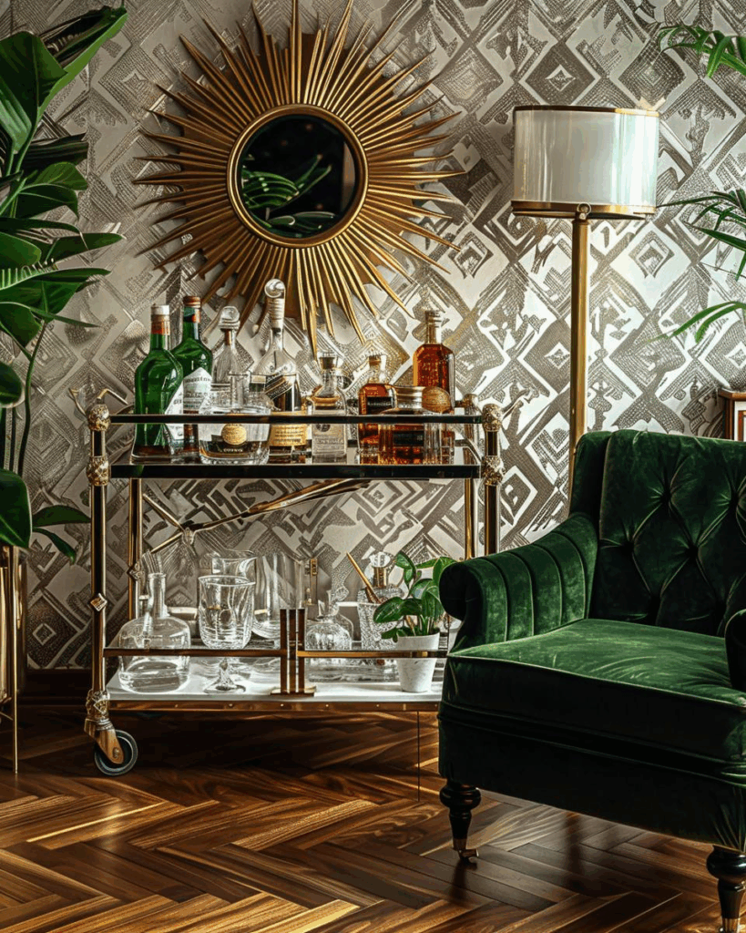 Richte eine glanzvolle Barwagen-Ecke ein. Ein Barwagen aus Messing oder Chrom bringt echten Art-Déco-Stil. Wir nutzen edle Gläser, Kristallkaraffen und ausgewählte Spirituosen. Ein großer Spiegel und eine kleine Lampe erzeugen echtes Flair. Ein schöner Untersetzer rundet das Bild ab.