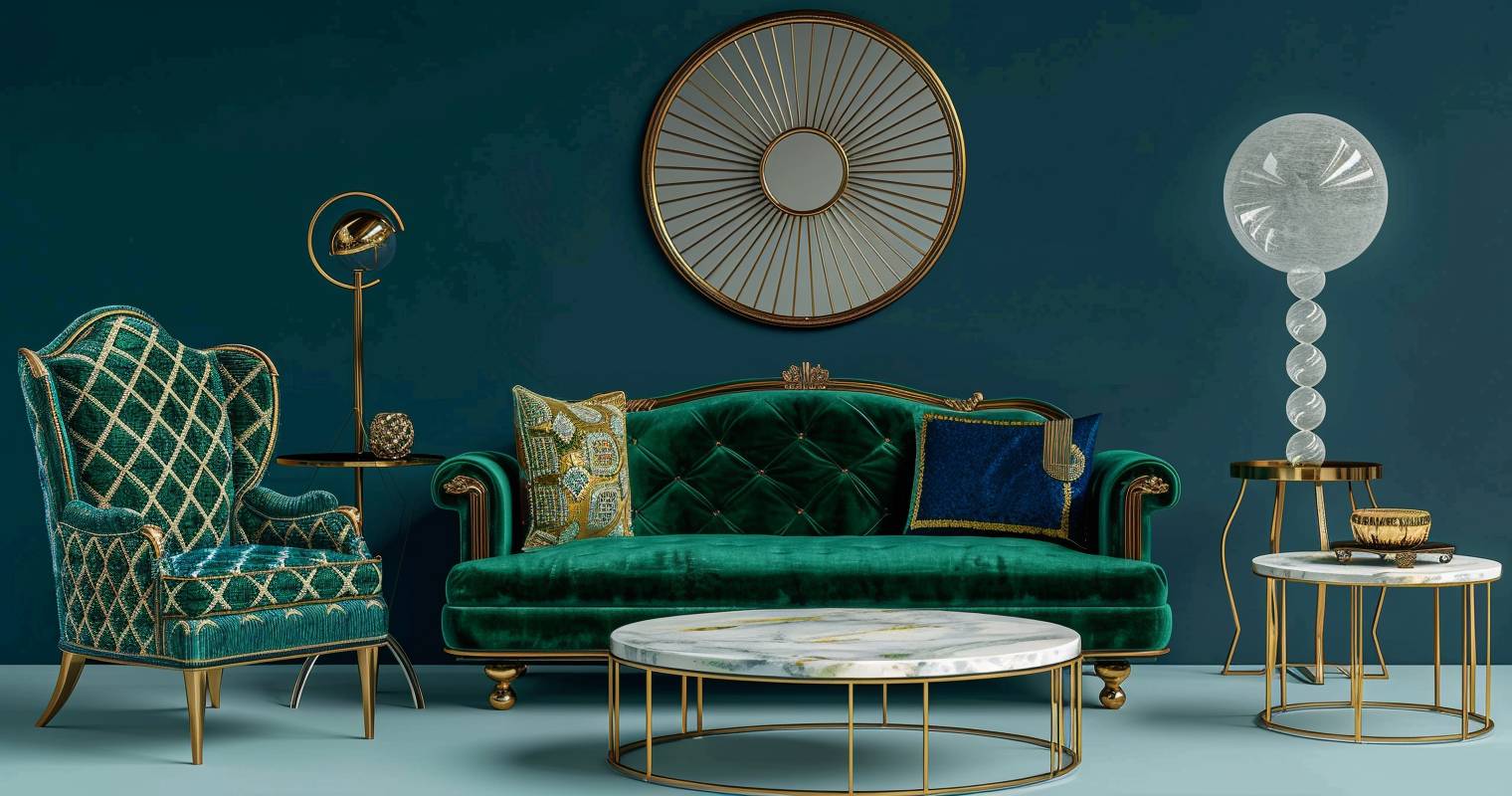 Ein Wohnzimmer im Art-Deco-Stil ist ein eleganter Raum, in dem wir mit klaren Linien, luxuriösen Materialien und starken Kontrasten gestalten und einrichten.