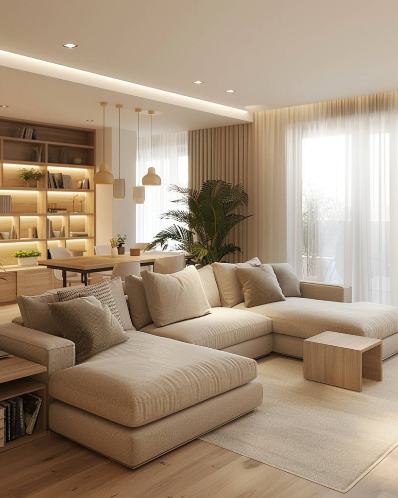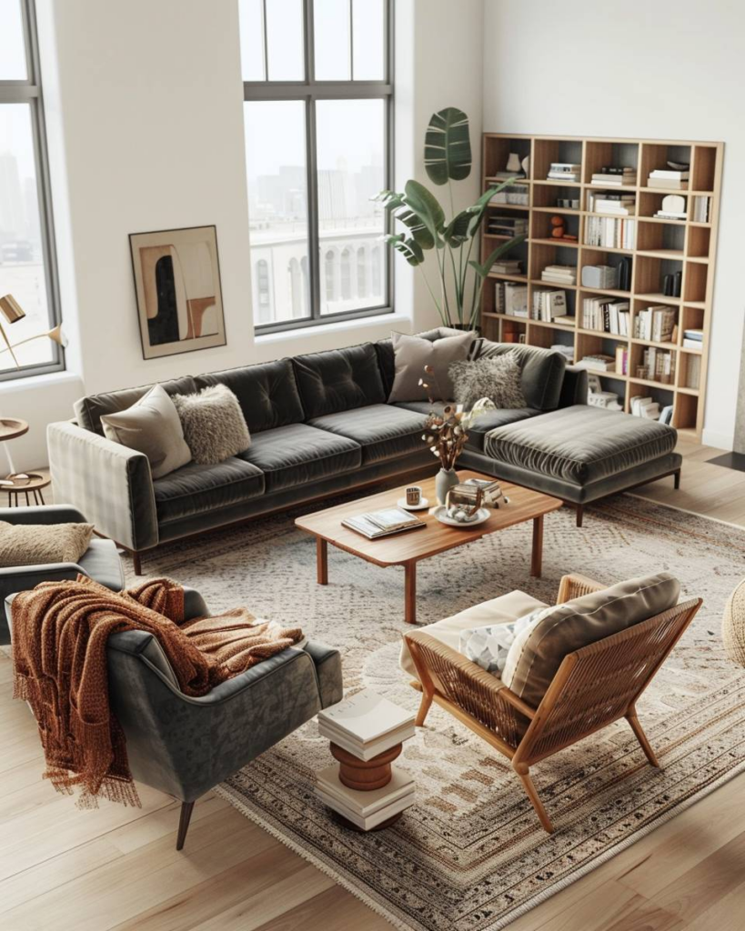 Nutze Teppiche, um Bereiche im L-förmigen Wohnzimmer zu trennen. Ein großer Teppich unter dem Sofa markiert die Sitzecke. Ein kleinerer Teppich unter dem Esstisch schafft einen klaren Essbereich. Mit Farbkontrasten und unterschiedlichen Materialien betonst du die verschiedenen Funktionen.