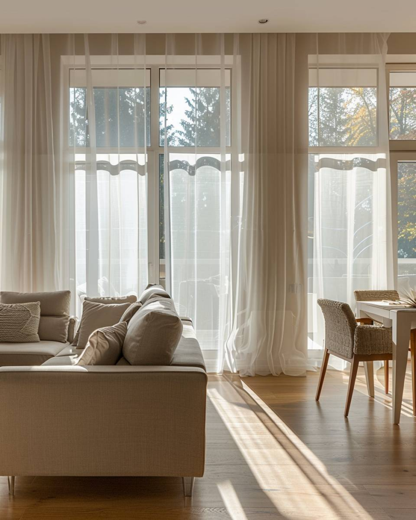 Trenne das Wohnzimmer mit Vorhängen ab. Wähle leichte Stoffe, die Licht durchlassen. Bringe Schiene und Vorhang flexibel an der Decke an. So schaffst du Rückzugsorte und lässt Wohn- und Essbereich harmonisch wirken.
