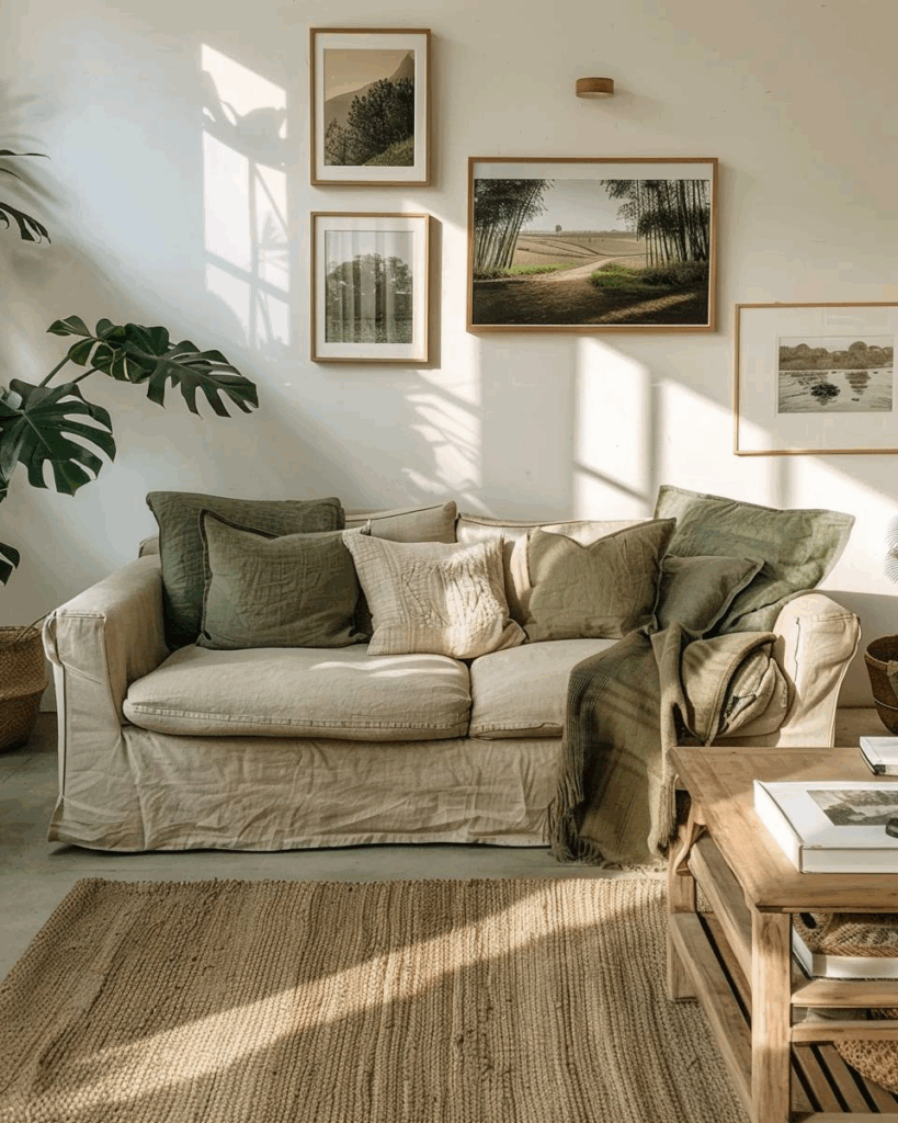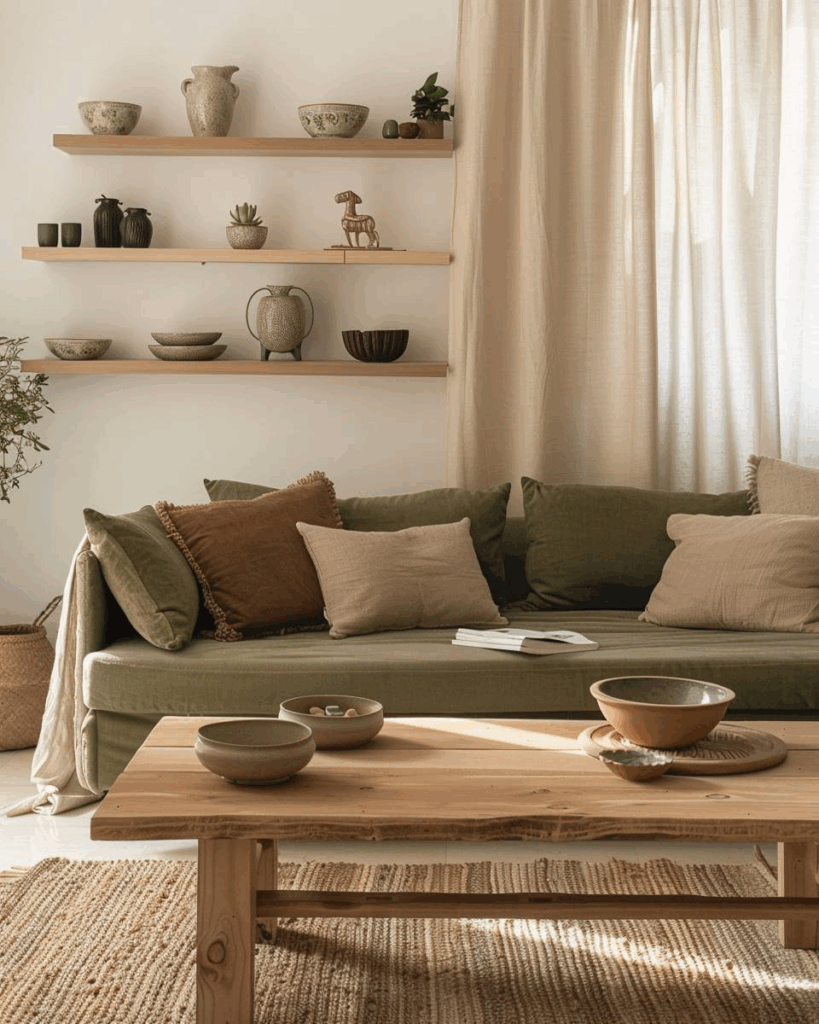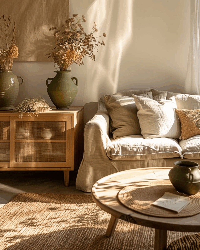 Mit erdigen Wandfarben, Möbeln aus hellem Holz und natürlichen Leinenkissen richten wir Wohnräume harmonisch ein und geben jedem Raum Charakter.