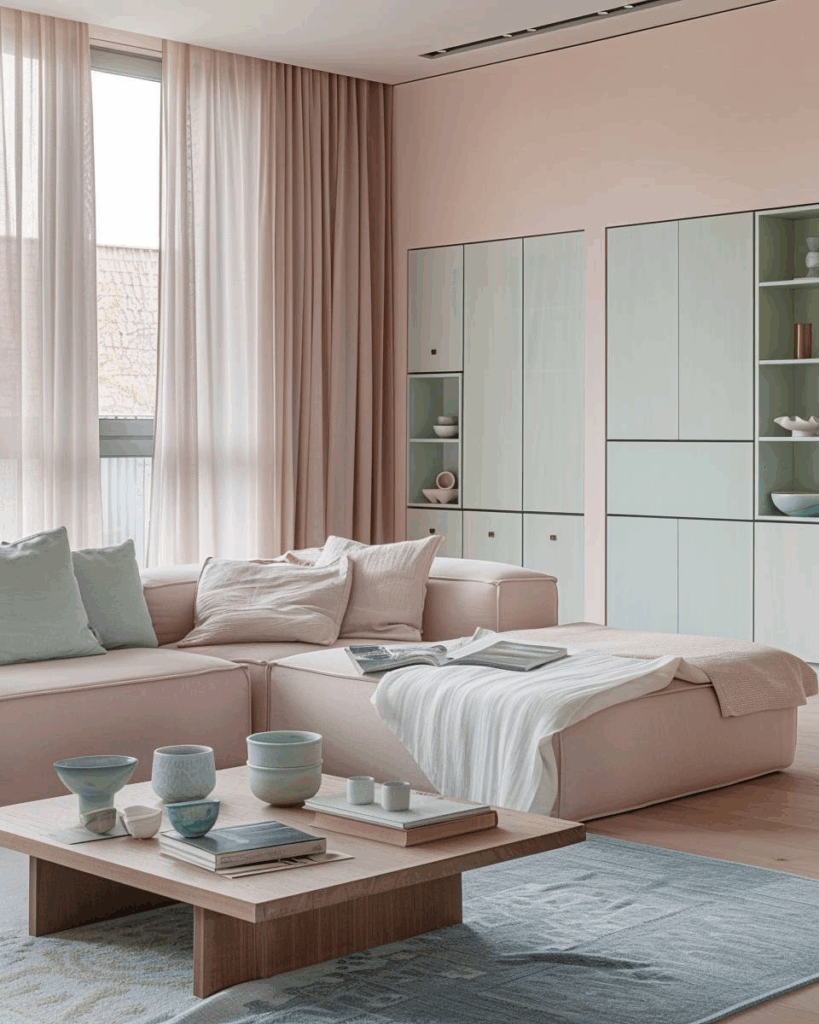 Ideen für Wohnzimmer in Pastellfarben- Ergänze natürliche Hölzer für Wärme