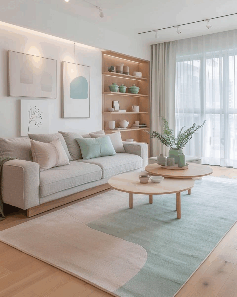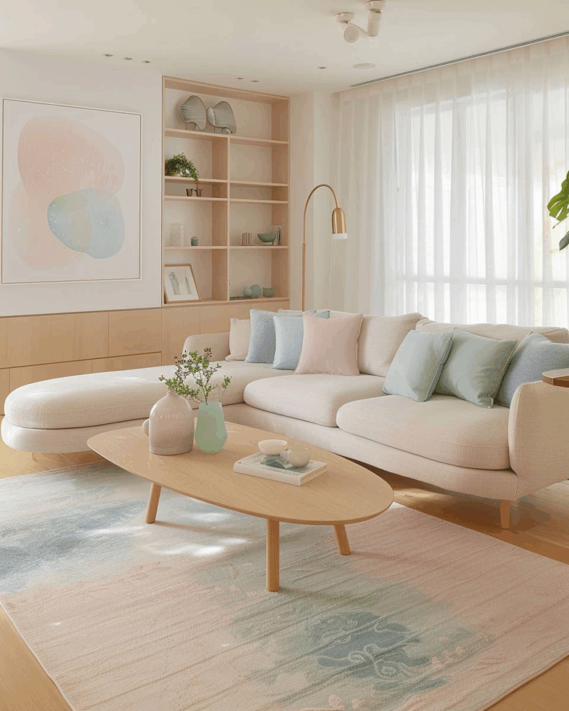 Lege einen weichen Pastellteppich unter den Couchtisch