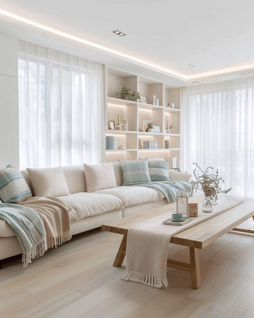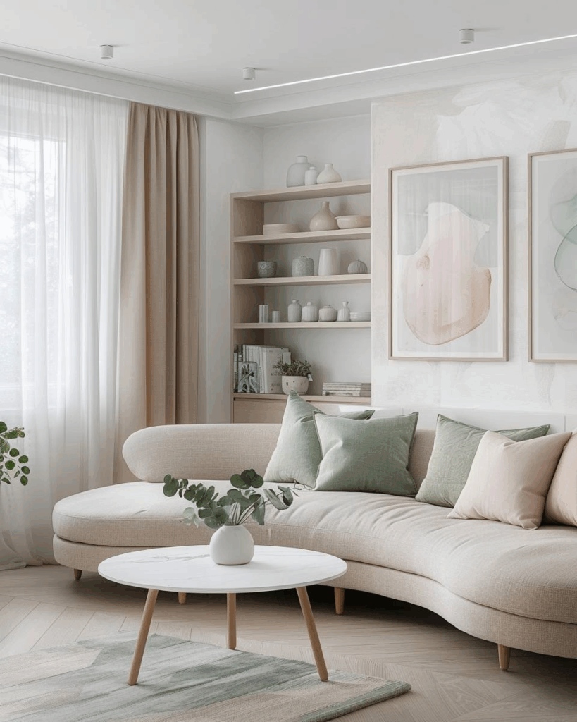 Wähle ein pastellblaues Sofa als Blickfang. Wir setzen auf Wände in Warmweiß als ruhige Basis. Eiche und Messing sind deine warmen Akzente. Kissen in Rosé, Creme und Salbeigrün sind der weiche Farbmix. Leinen- oder Bouclé-Bezug und warmes Licht geben dir Ruhe und Tiefe.