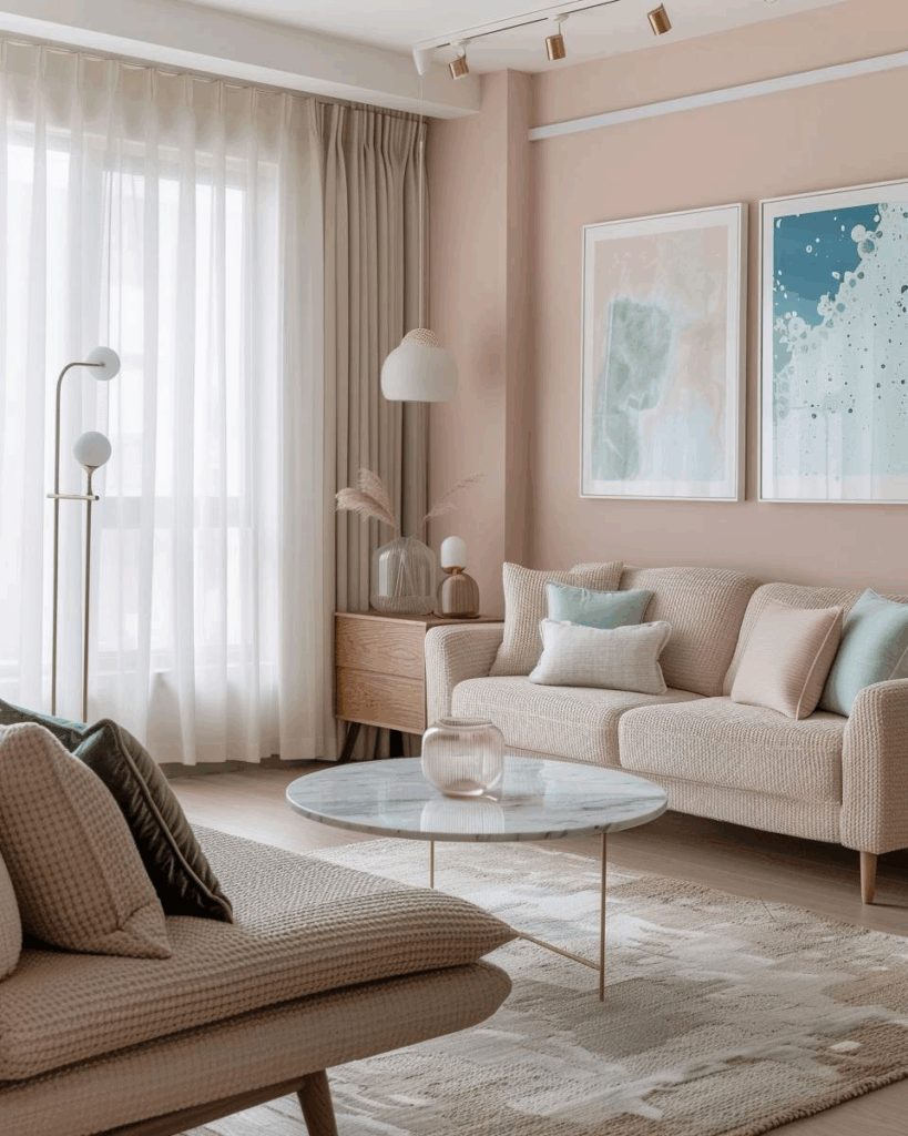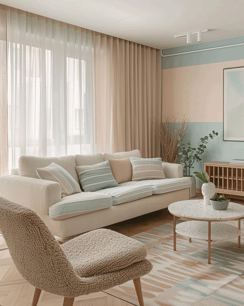 Ideen für Wohnzimmer in Pastellfarben- Hänge leichte Vorhänge in Pudertönen auf