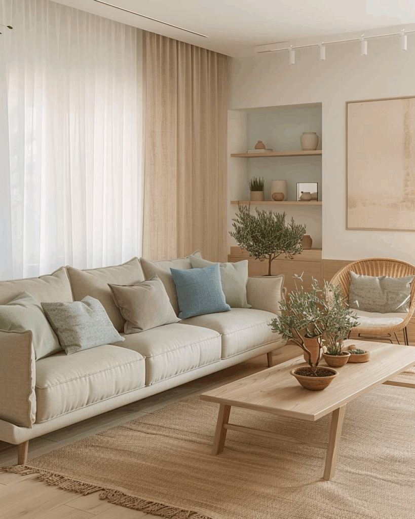Wir raten dir, im Wohnzimmer eine weiche Farbpalette mit Naturtönen zu wählen. Wandfarbe ist warmes Beige oder Greige in Matt. Akzentfarbe ist zartes Salbeigrün an Kissen und Deko. Holz ist helle Eiche oder Rattan für Möbel und Rahmen. Textilien sind Leinen, Wolle und Jute für Teppich und Vorhänge.