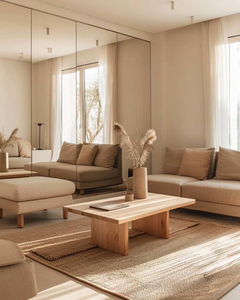 Mit großen Spiegeln schaffen wir mehr Weite im Wohnzimmer. Wir platzieren Spiegel so, dass sie Licht reflektieren und sandfarbene Möbel oder Wände doppelt wirken. So sieht der Raum sofort größer und freundlicher aus.