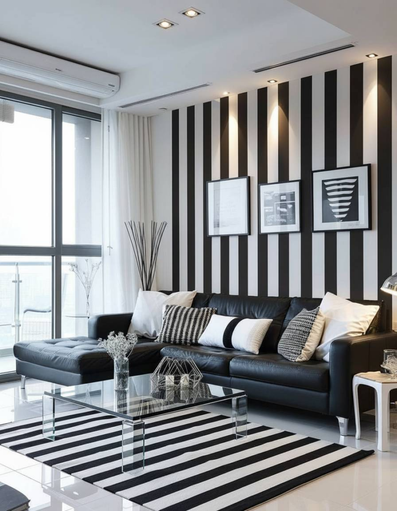 Streck den Raum optisch mit vertikalen Streifen. Vertikale Tapetenmuster oder Streifen an den Wänden lassen dein Wohnzimmer höher wirken. Kombiniere dazu klare Schwarz-Weiß-Kontraste und halte Möbel schlicht. So erzielst du einen luftigen und modernen Look.