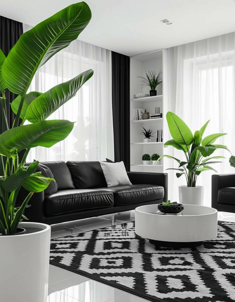Bringe Pflanzen ins Wohnzimmer, um starke Farbtupfer in das Schwarz-Weiß-Konzept zu holen. Grüne Blätter setzen Akzente und lassen den Raum lebendig wirken. Wähle klare Formen wie eine Monstera oder einen Farn. Setze die Pflanzen in schlichten Töpfen ein, damit sie Ruhe und Frische ausstrahlen.