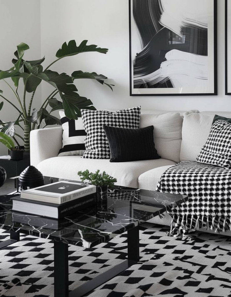 Setze verschiedene Muster ein, um dein Wohnzimmer lebendiger zu machen. Streifen, Karos und Punkte auf Kissen, Teppichen oder Vorhängen bringen Struktur in einen schwarz-weißen Raum. Unterschiedliche Texturen wie Wolle, Leder oder Samt verstärken diesen Effekt. Wir achten auf kleine Flächen und dezente Wiederholungen, damit der Raum nicht zu unruhig wirkt.