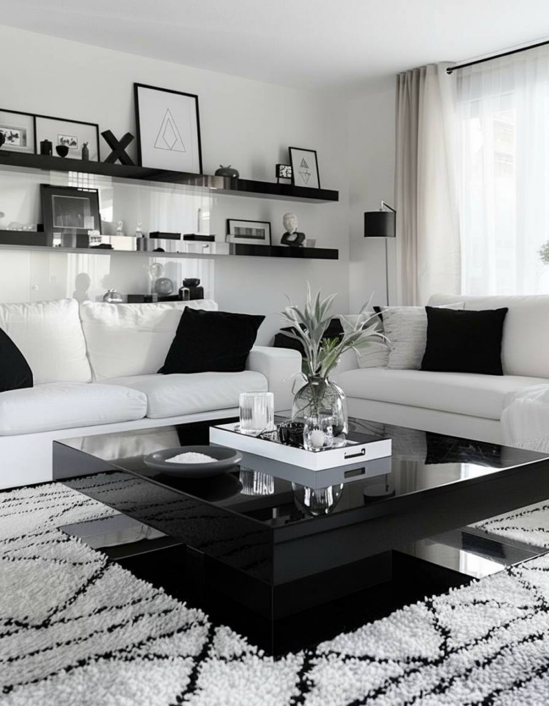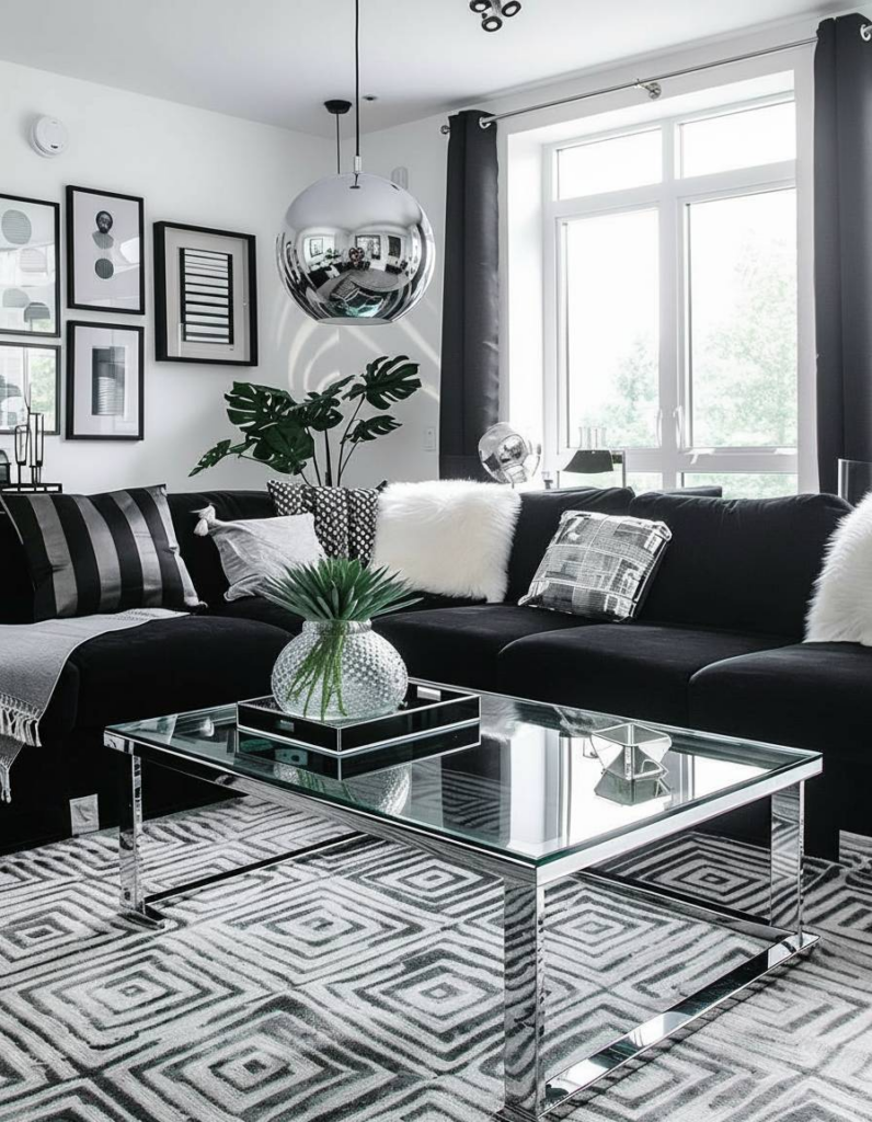Setze Glas und Metall gezielt ein, um das Wohnzimmer lebendig wirken zu lassen. Glasvasen und Couchtische bringen Leichtigkeit in den Raum. Lampen und Bilderrahmen aus Metall setzen klare Akzente. Diese Materialien reflektieren Licht und verstärken den Kontrast im Schwarz-Weiß-Konzept.