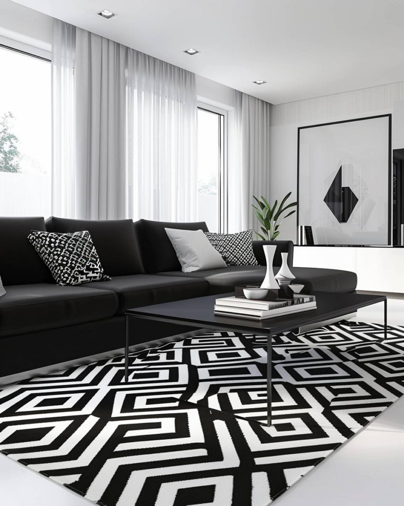Setze große Teppiche mit klaren geometrischen Mustern ein, um starke Kontraste im Wohnzimmer zu schaffen. Ein schwarz-weißer Teppich ist die perfekte Basis für deine Einrichtung. Wir kombinieren dazu schlichte Möbel und setzen so gezielt Akzente. Grafische Muster bringen sofort mehr Dynamik und Ordnung in deinen Raum.