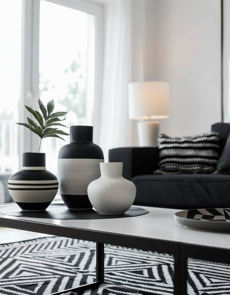 Setze schwarz-weiße Vasen gezielt auf Sideboards oder Regalen ein. Ihre klaren Linien und matten Oberflächen bringen Ruhe. Glas, Keramik oder Porzellan sind ideal. Farbliche Einfachheit sorgt für einen starken Kontrast zur Wohnzimmerdekoration. Einzeln oder in Gruppen ziehen sie alle Blicke auf sich.
