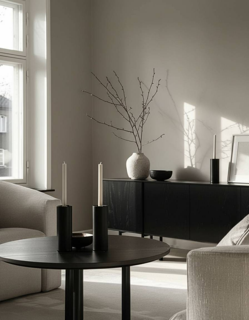 Wähle schlichte Sessel, Sofas oder Hocker mit klaren Linien. Wir setzen auf glatte Oberflächen, dezente Farben und vermeiden Schnörkel. So wirkt das Wohnzimmer ruhig und modern. Kissen in schwarz, weiß oder grau ergänzen den Look. Die Möbel fügen sich geradlinig in den Raum ein.