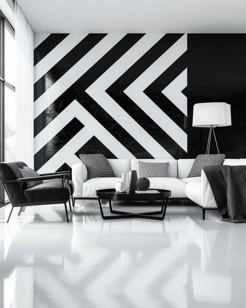 Nutze markante Muster an der Wand für mehr Spannung im Raum. Schwarz-weiße Streifen oder geometrische Formen bringen Struktur und lassen dein Wohnzimmer klar wirken. Wir setzen nur ein Muster pro Wand ein, damit du Ruhe behältst. Halte die restliche Deko schlicht, damit die Muster wirken.