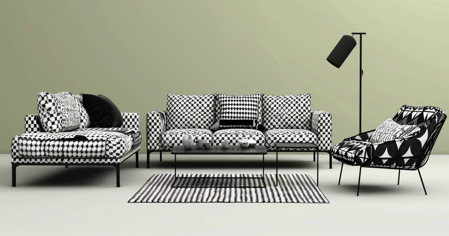 Setze große Teppiche mit klaren geometrischen Mustern ein, um starke Kontraste im Wohnzimmer zu schaffen. Ein schwarz-weißer Teppich ist die perfekte Basis für deine Einrichtung. Wir kombinieren dazu schlichte Möbel und setzen so gezielt Akzente. Grafische Muster bringen sofort mehr Dynamik und Ordnung in deinen Raum.