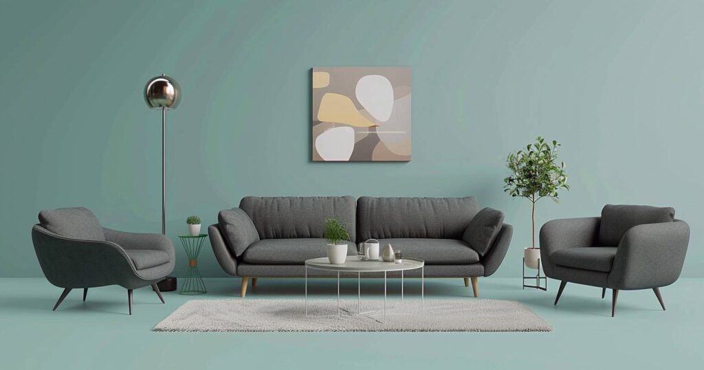 Wähle schlichte Sessel, Sofas oder Hocker mit klaren Linien. Wir setzen auf glatte Oberflächen, dezente Farben und vermeiden Schnörkel. So wirkt das Wohnzimmer ruhig und modern. Kissen in schwarz, weiß oder grau ergänzen den Look. Die Möbel fügen sich geradlinig in den Raum ein.