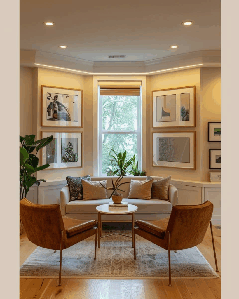 Hänge eine Kunstwand in deinen Erker. Wir wählen gleich große oder verschieden große Bilderrahmen und orientieren uns an einer sichtbaren mittleren Linie. Halte zwischen jedem Bild den gleichen Abstand. Verwende Motivgruppen wie Natur, Architektur oder Familienfotos. Passe die Farben an dein Wohnzimmer an.