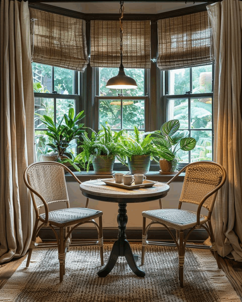 Richte ein kleines Café im Erker ein. Bistrostühle und ein runder Bistrotisch passen perfekt in die Nische. Mit einer Tischleuchte und kleinen Pflanzen schaffen wir eine gemütliche Ecke zum Lesen oder Kaffeetrinken. Setze auf helle Farben und platzsparende Möbel.
