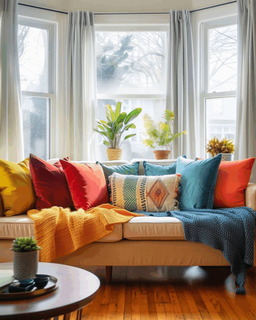 Dekoriere mit farbenfrohen Kissen und Decken