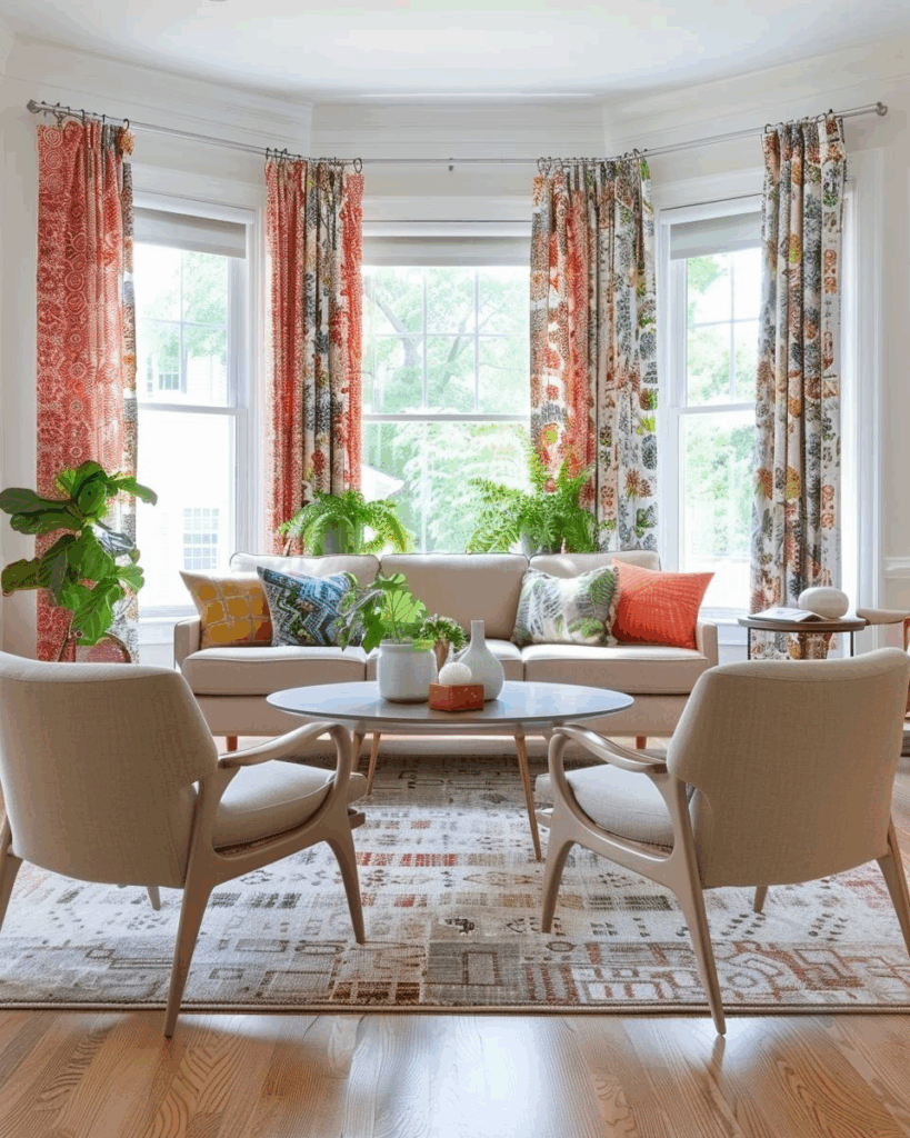 Bunte Stoffe am Erkerfenster bringen Farbe ins Wohnzimmer. Wir wählen Vorhänge, die Licht durchlassen und das Zimmer lebendig machen. Rollos oder raffbare Gardinen setzen Akzente und lassen sich leicht neu arrangieren. Du veränderst so schnell Stimmung und Ausblick. Wir stimmen Muster, Materialien und Farben auf deine Möbel ab.