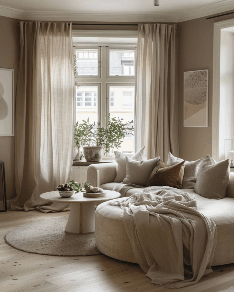 Wähle ein rundes Sofa für den Erker. Die runde Form schließt die Ecken harmonisch ein und bringt Ruhe ins Zimmer. Damit nutzt du den Platz optimal und schaffst eine warme Sitzgruppe. Kombiniere es mit einem runden Teppich und niedrigen Tisch, damit alles zusammenpasst.
