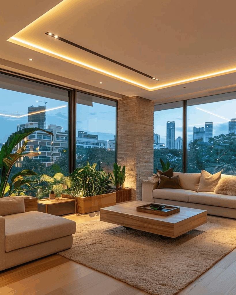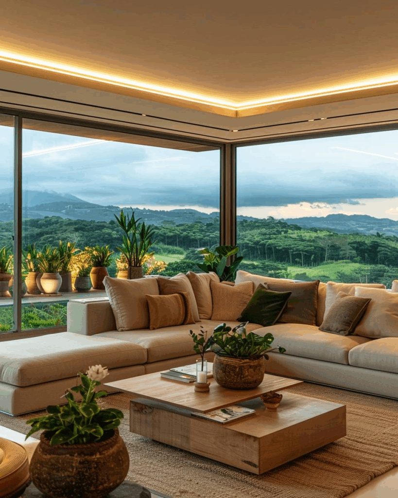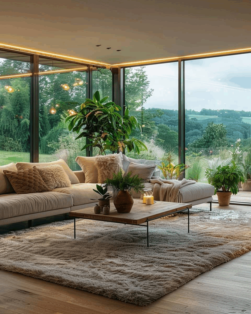 Wohnzimmer mit Panoramafenster- Integriere smarte Steuerung für das Raumklima