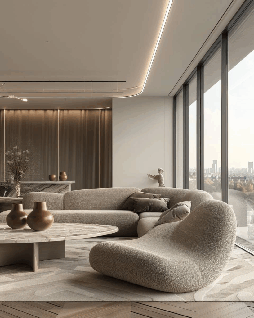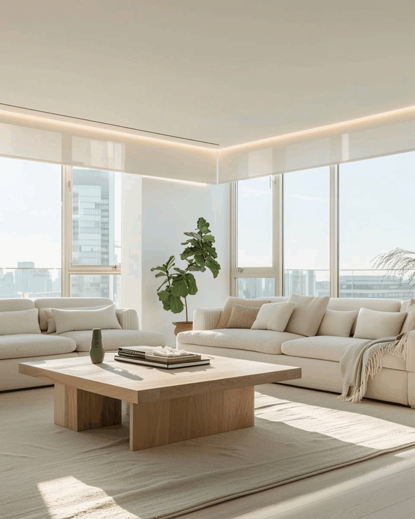 Gestalte deinen Raum mit gemütlichen Loungemöbeln vor dem Fenster, richte Sitzplätze zum Ausblick hin aus und nutze transparente Vorhänge für sanfte Lichtfilterung.