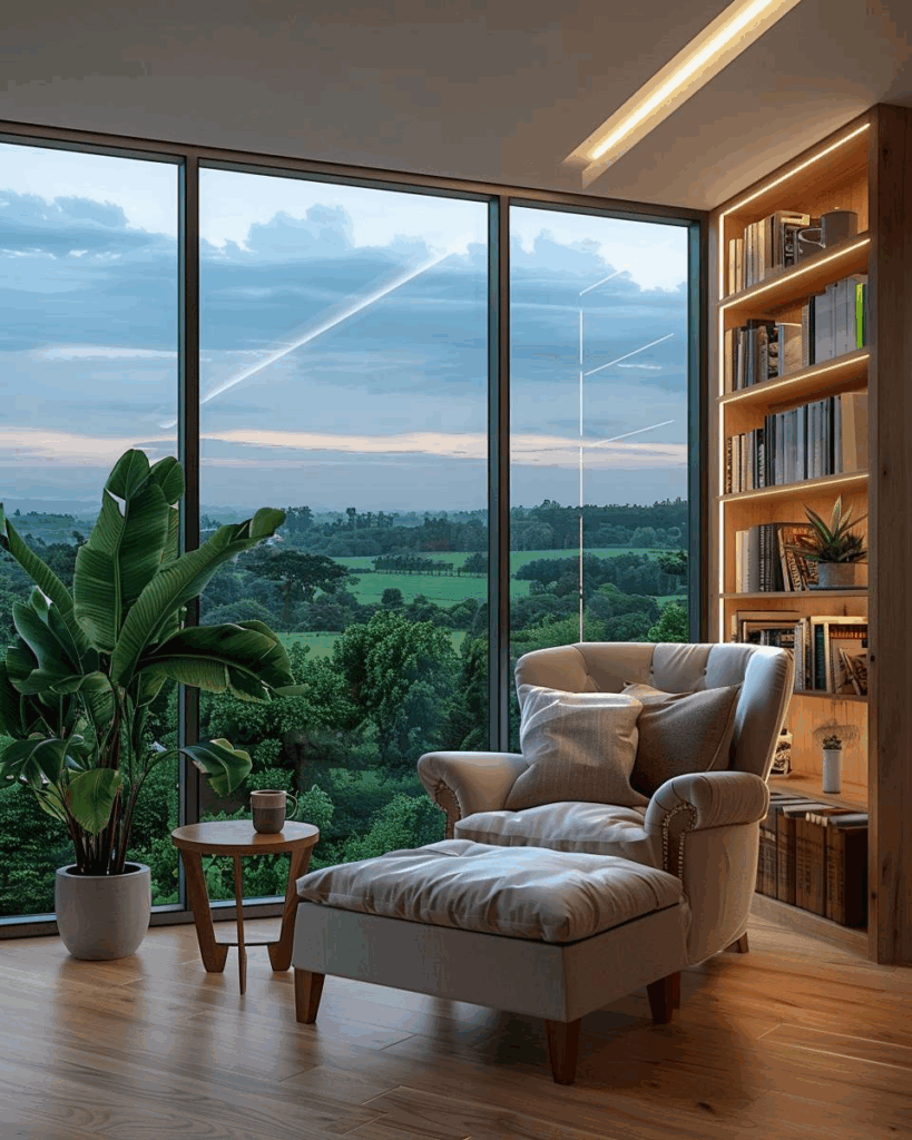 Gestalte einen gemütlichen Leseplatz am Panoramafenster. Ein bequemer Sessel und ein kleiner Beistelltisch bieten dir Platz für Bücher und Getränke. Mit einem weichen Kissen und einer Decke wird der Platz noch einladender. Das Tageslicht und der freie Blick in die Natur entspannen deine Augen und geben dir Ruhe beim Lesen.