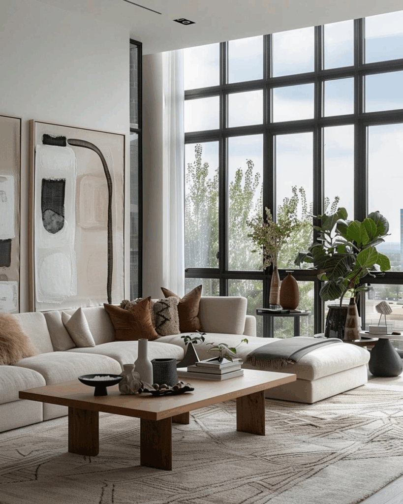 Wohnzimmer mit Panoramafenster- Kombiniere verschiedene Texturen für mehr Gemütlichkeit